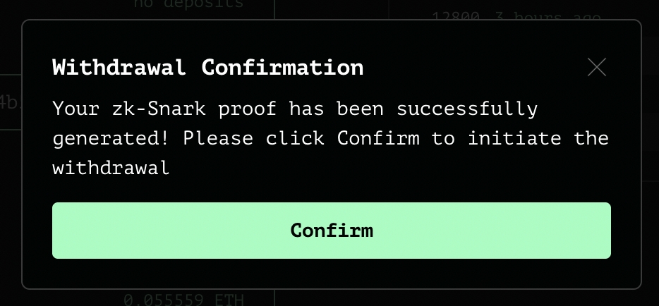 Используйте свою заметку о депозите, вставив ее в соответствующее поле. Нажмите «Вывести» и дождитесь генерации доказательства zk-Snark.
