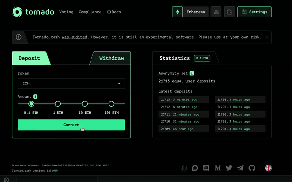 Чтобы подключить свой кошелек к Tornado Cash, у вас есть два варианта: вы можете нажать Подключить на главной странице Tornado Cash, сразу после выбора суммы депозита.